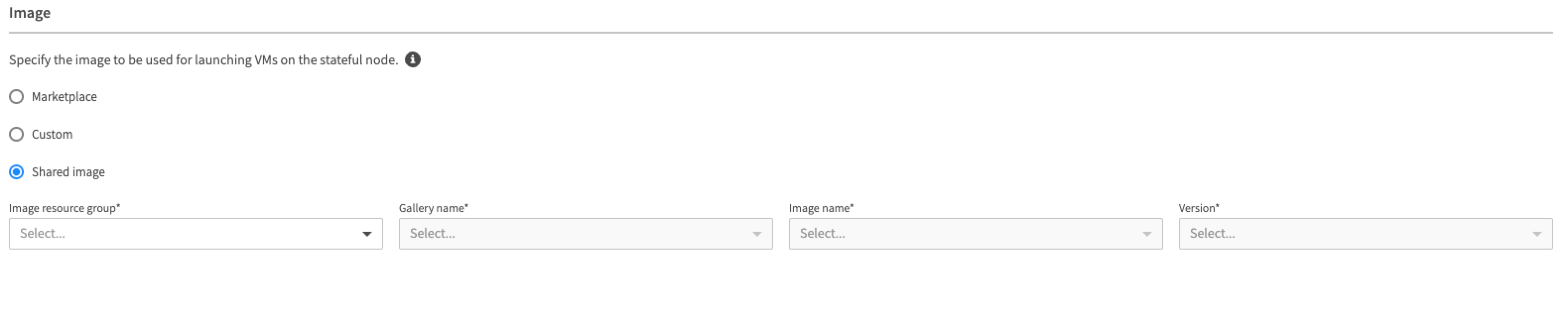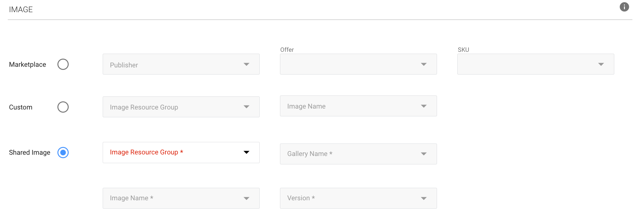 2. Choose Shared Image and choose the relevant item from each of the following dropdown lists:
