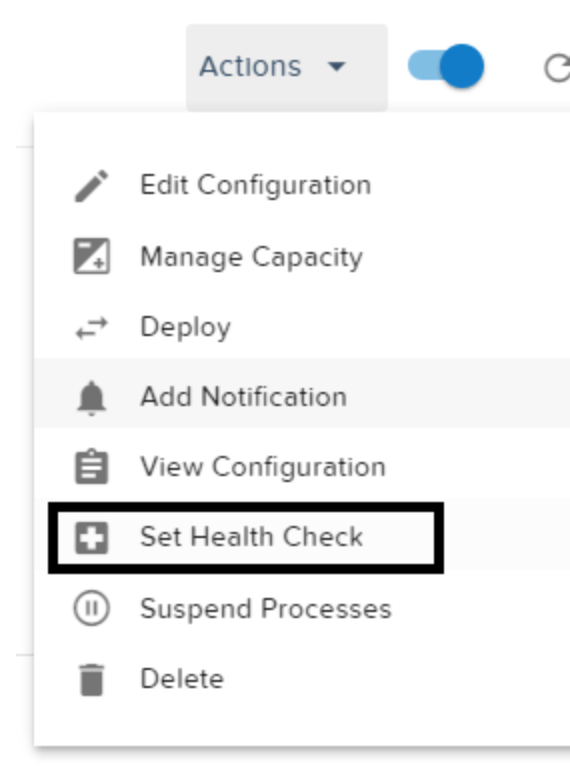 1. Go to your Elastigroup and click on the Actions menu at the top left. Click on Set Health Check from the menu: