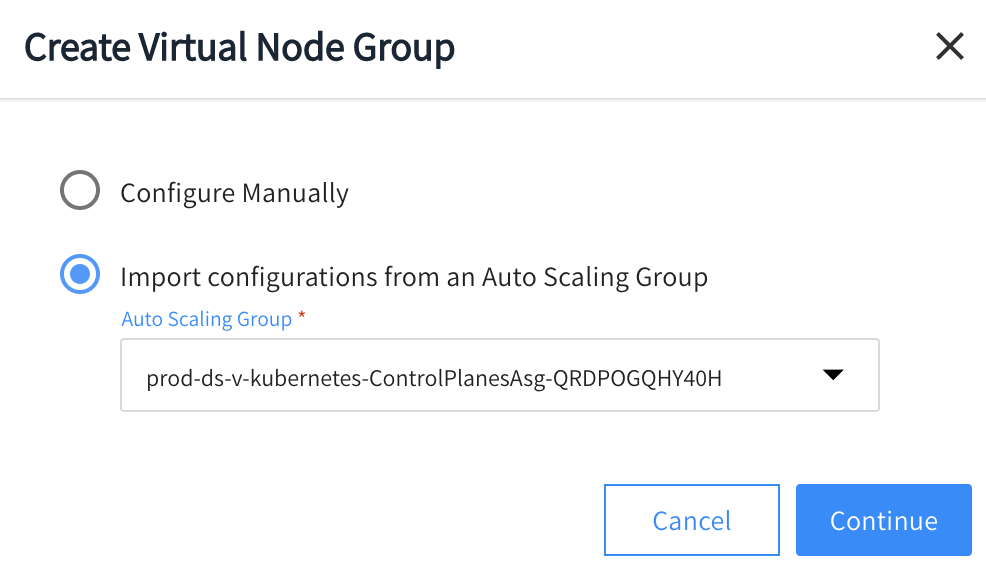 Click Configure Manually or choose to import from an existing Autoscaling Group (AWS) or Node Pool (AKS and GKE).